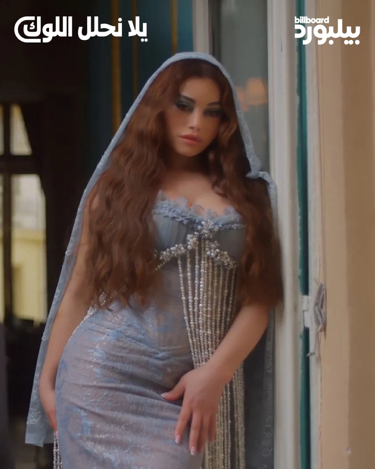 في الإطلالة الأولى، ظهرت هيفاء بفستان أزرق مزيّن بحبال من اللؤلؤ، نسّقه خليل مع طرحة طويلة من الدانتيل غطّت جزءاً من وجهها. الفستان حمل توقيع جيانا يونس، فيما اختارت معه حذاءً من ديور. هذه الإطلالة انسجمت مع الجانب الرومانسي في الأغنية، فالأزرق الرقيق والطرحة الحالمة شكّلا ترجمة بصرية لإيقاعها العاطفي ولمشاهد القصر المليئة بالرمزية.