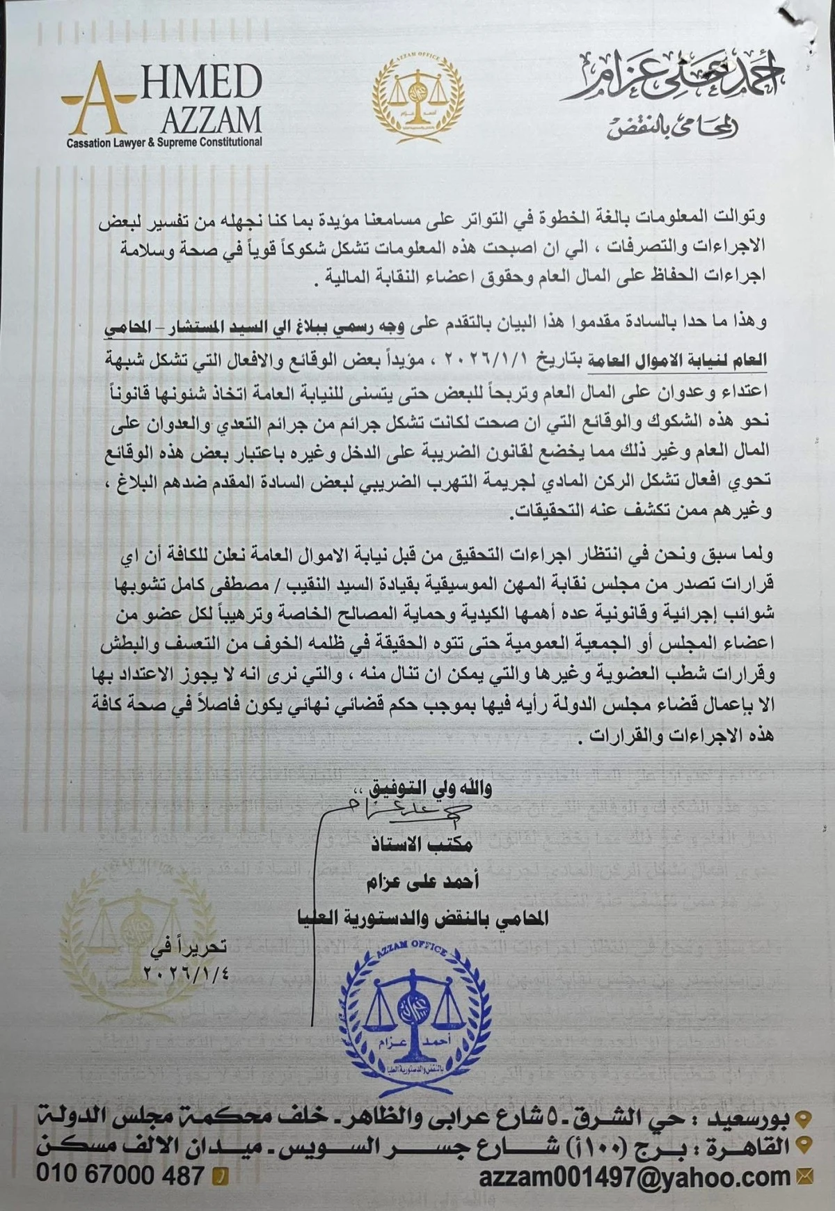 تحذير قانوني ودعاوى أمام نيابة الأموال العامة