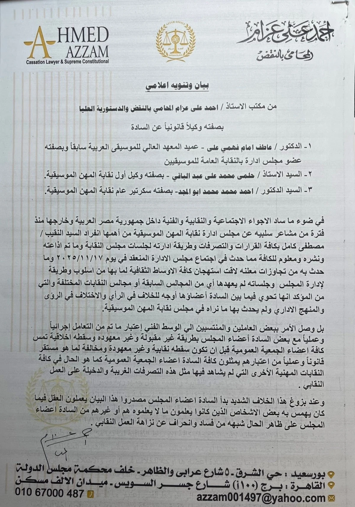 وفي تطور لاحق، أصدر أحمد علي عزام المحامي بالنقض والدستورية العليا بيانًا رسميًا حذّر فيه من اتخاذ أي إجراءات إدارية بحق كل من حلمي عبد الباقي وأحمد أبو المجد سكرتير عام النقابة، اللذين أُحيلا إلى مجلس التأديب، إضافة إلى عاطف إمام فهمي عضو مجلس النقابة، وذلك لحين صدور قرارات نيابة الأموال العامة.