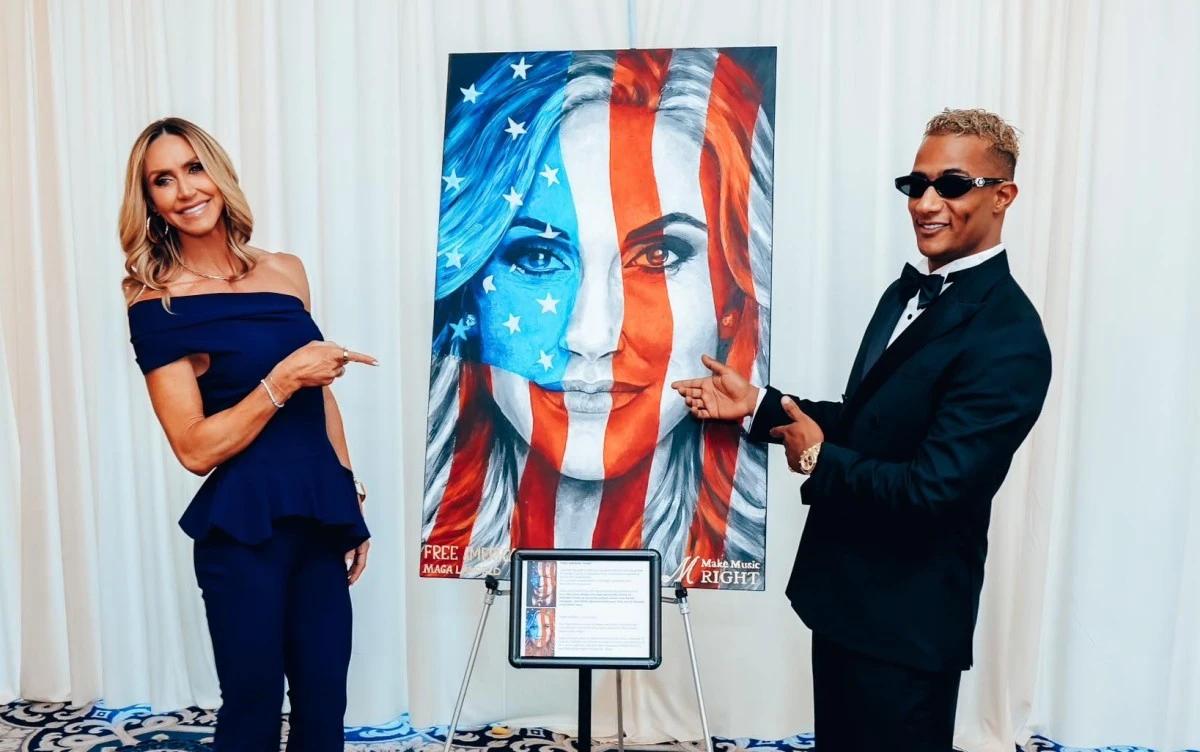 وأظهرت الصورة رمضان مرتدياً بدلة سوداء ونظارات شمسية واقفا مع لارا ترمب تتوسطهما صورة كبيرة لوجهها مع ألوان العلم الأميركي.