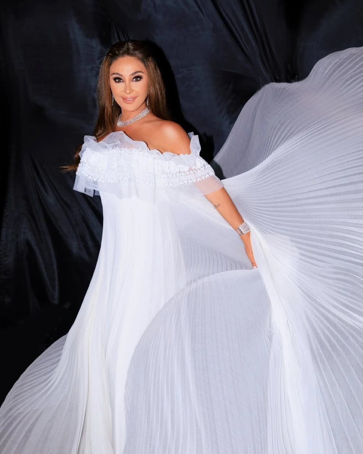 في مهرجانات بيروت، خطفت الأنظار بفستان أبيض بليسيه بقصّة الأوف شولدر، فبدت كعروس تفيض أنوثة في ليلة فنية مميزة.